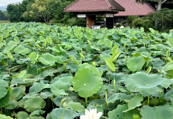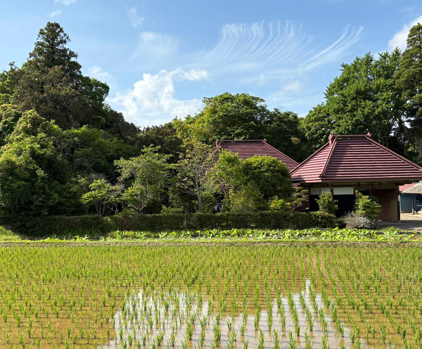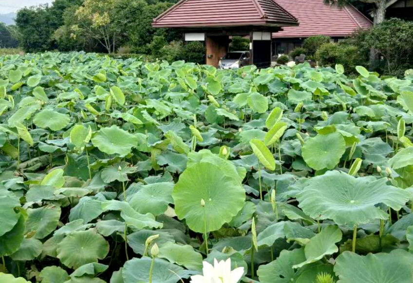 長門の前には壮観な蓮根畑や野山が広がり、非日常をたっぷりと体感できます。